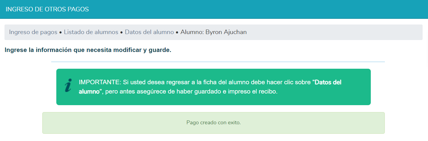 5. En "Pagos Varios", llenar el formulario y dar click en "Agregar y Guardar". Se puede agregar mas de un tipo de pago en el mismo recibo, por ejemplo uniforme, libros, excursión, diplomado, etc. Es importante aclarar que al terminar de hacer ya sea un "Pago Vario" o "Pago Mensual", si ya no se agregara ningún pago al recibo, se debe seleccionar en la opción "Datos del Alumno".