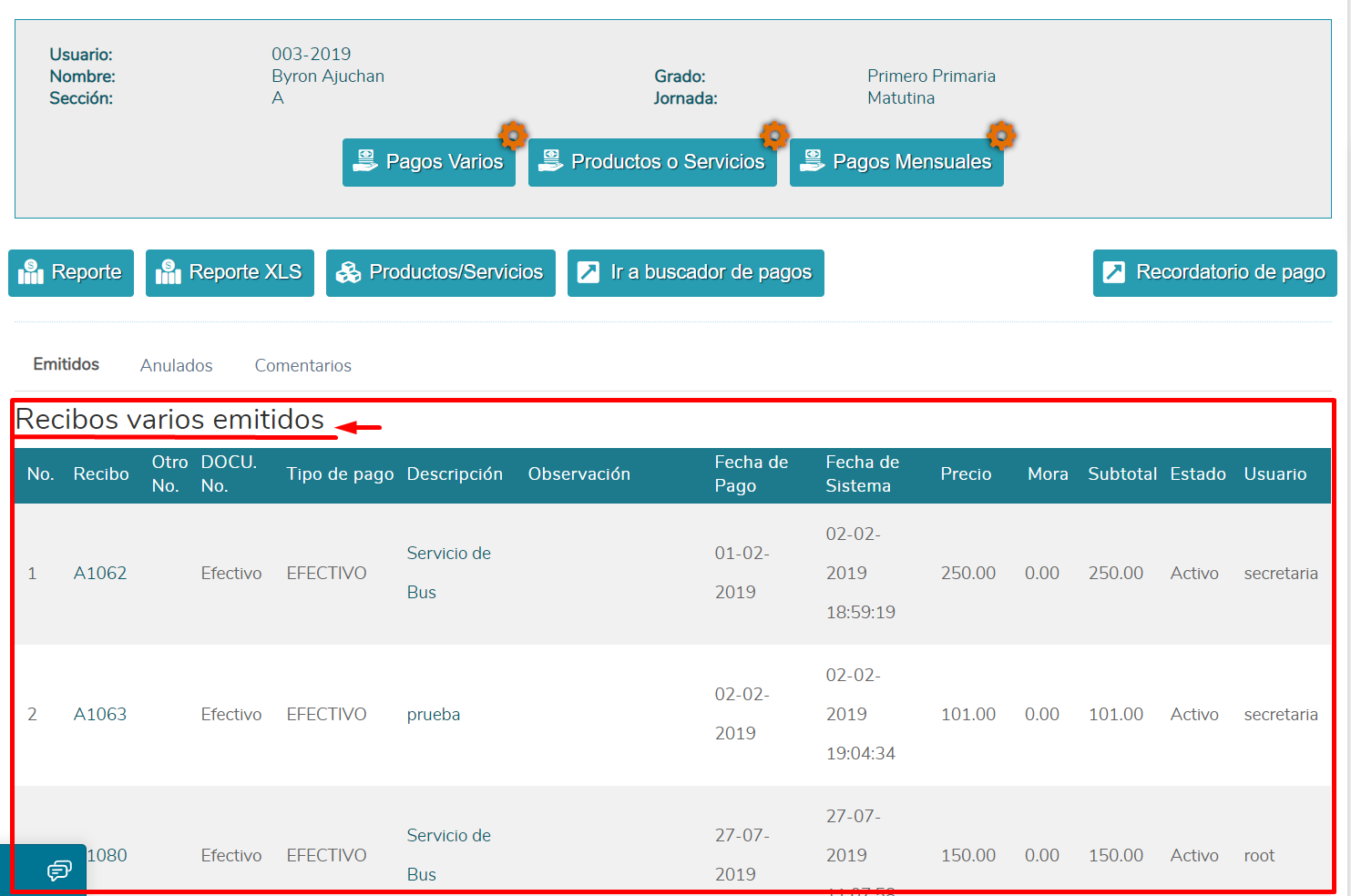 7. Tanto en "Pagos Varios" como en "Pagos Mensuales se encuentran habilitadas las opciones, "Anular" e "Imprimir". La opción "Anular" solicitara contraseña de autorización, que es del administrador. Y se guarda el historial.