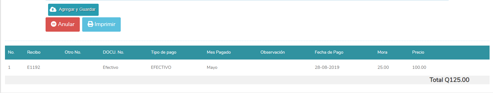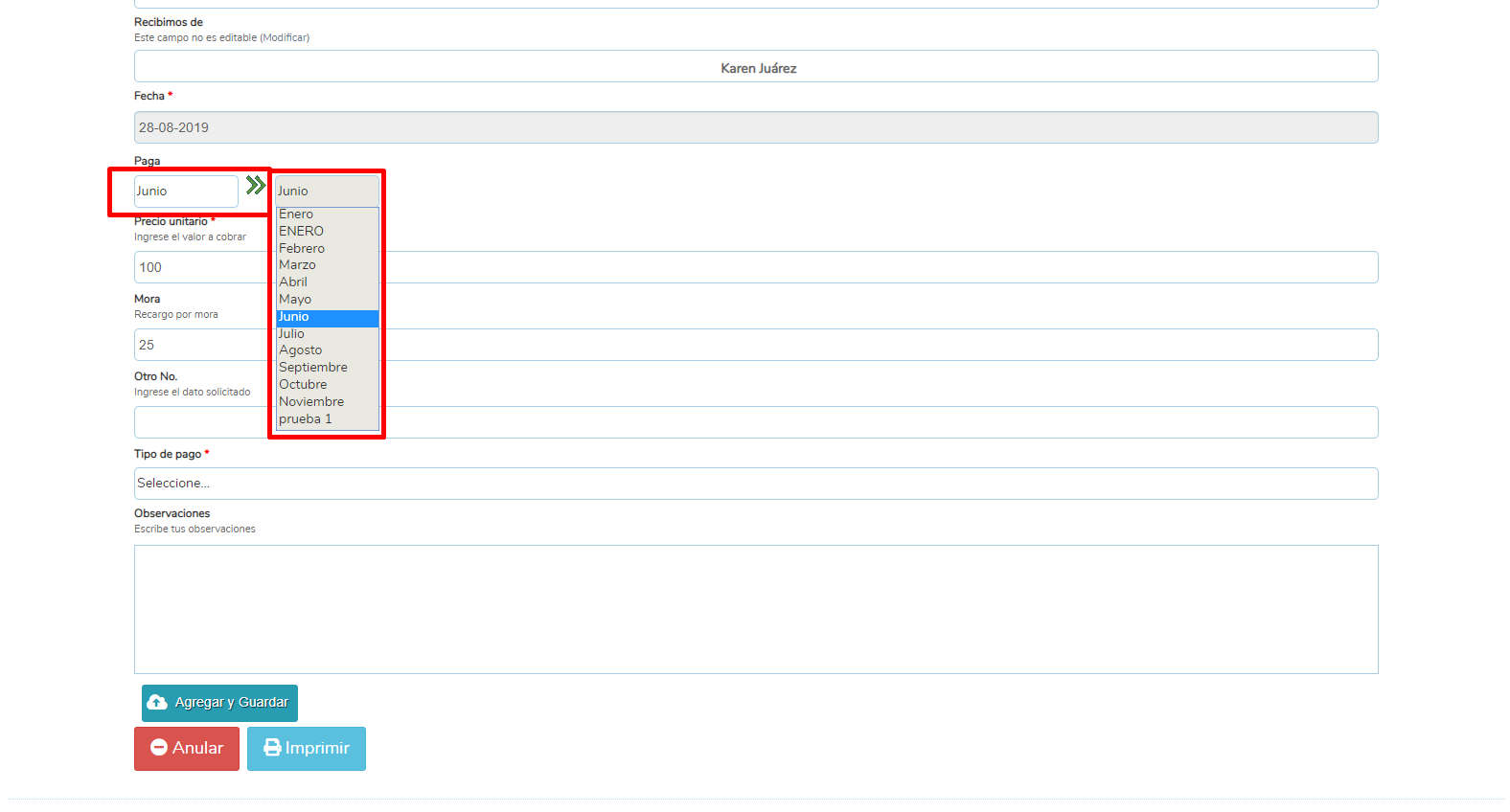 6. En "Pagos Mensuales", llenar el formulario y dar click en "Agregar y Guardar". Se puede agregar más de un pago en el mismo recibo. Por ejemplo inscripción, enero, febrero, etc., dependiendo de la cantidad de meses que deseen cancelar.