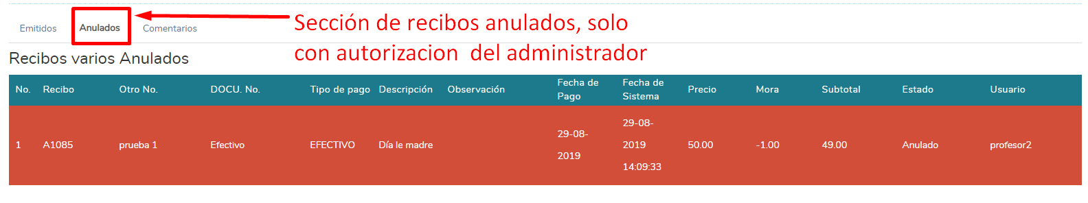 Para Anulación de recibos solo se puede hacer con la contraseña del administrador.
