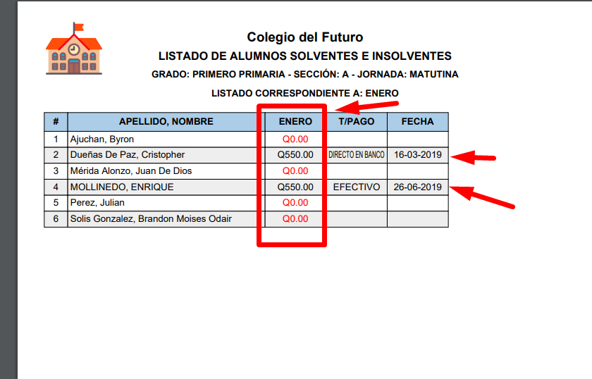 De esta forma podemos verificar inmediatamente que alumno en que grado se encuentra insolvente en el pago de sus mensualidades o inscripción.