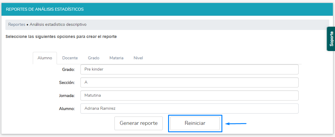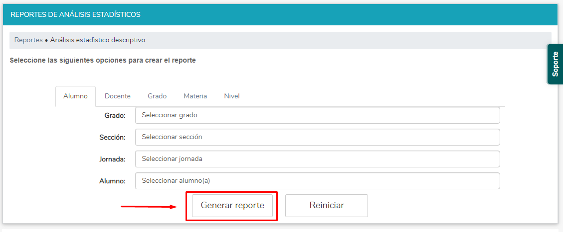 - Seleccione el “grado”, “sección”, “jornada” y “alumno” y se da clic a "Generar informe".