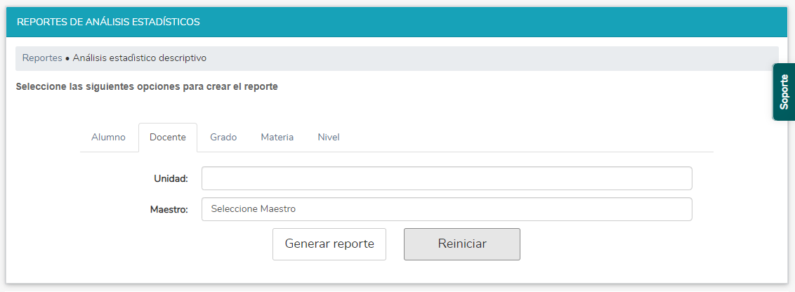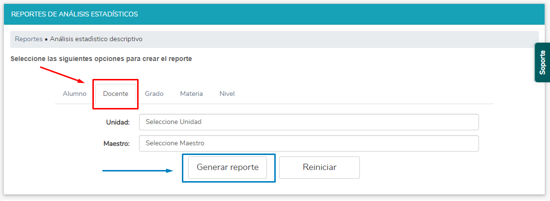 - En la etiqueta "Docente" de igual manera seleccionamos los datos en los campos de "unidad" y en "maestro" y le daremos clic en "Generar informe".
