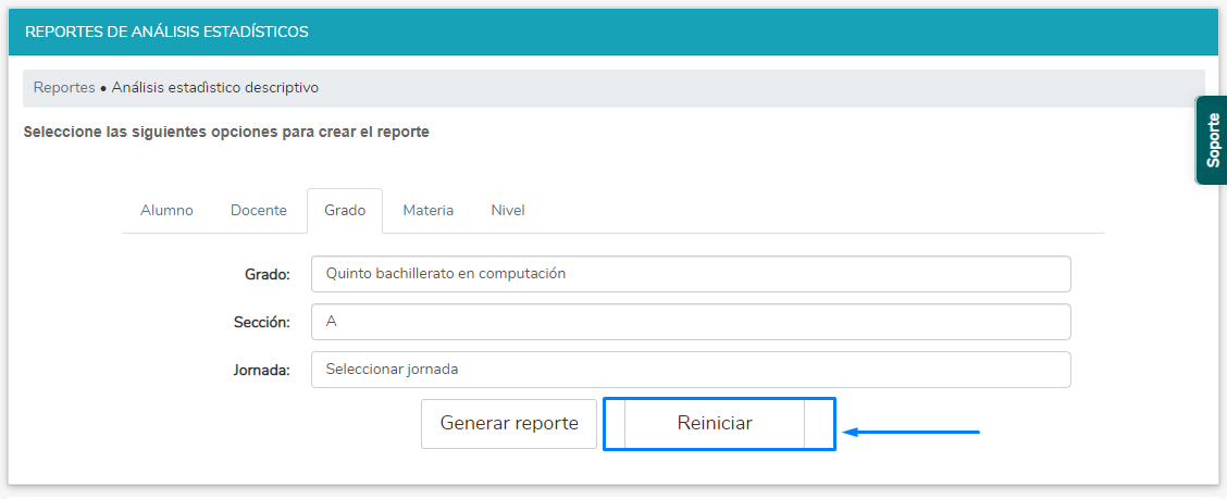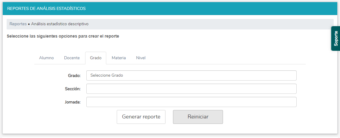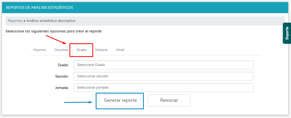 - En la etiqueta "Grado" de igual manera seleccionamos los datos en los campos "grado", "sección", "jornada" y le daremos clic en "Generar informe".