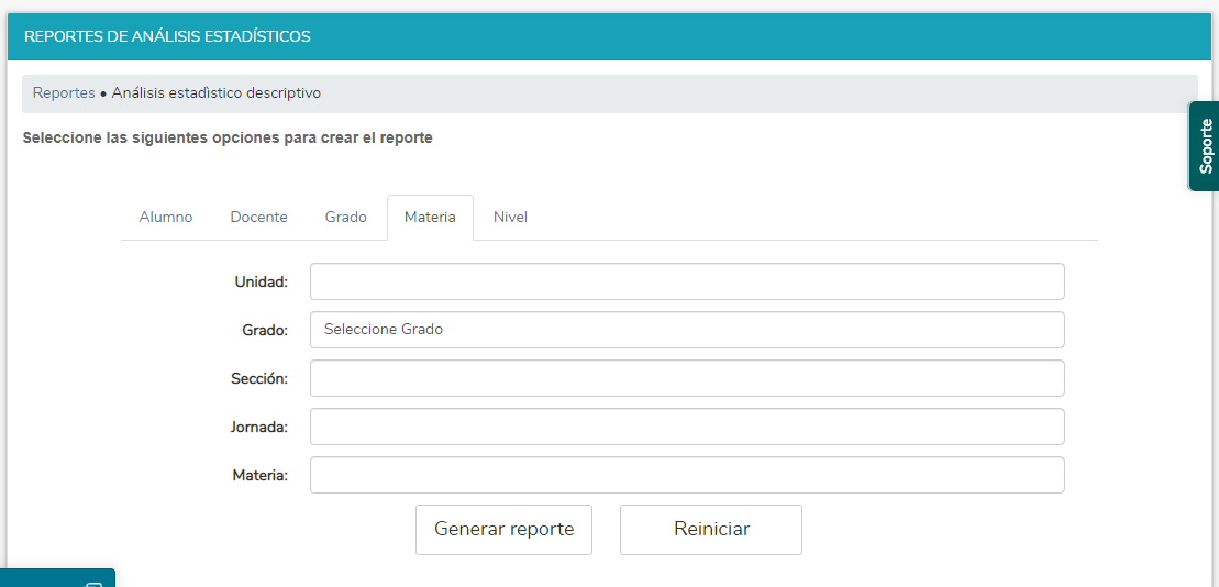 - En la etiqueta “Materia” de igual manera seleccionamos los datos en los campos “unidad”, “grado”, “sección”, “jornada”, “materia” y le daremos clic en “Generar informe”.