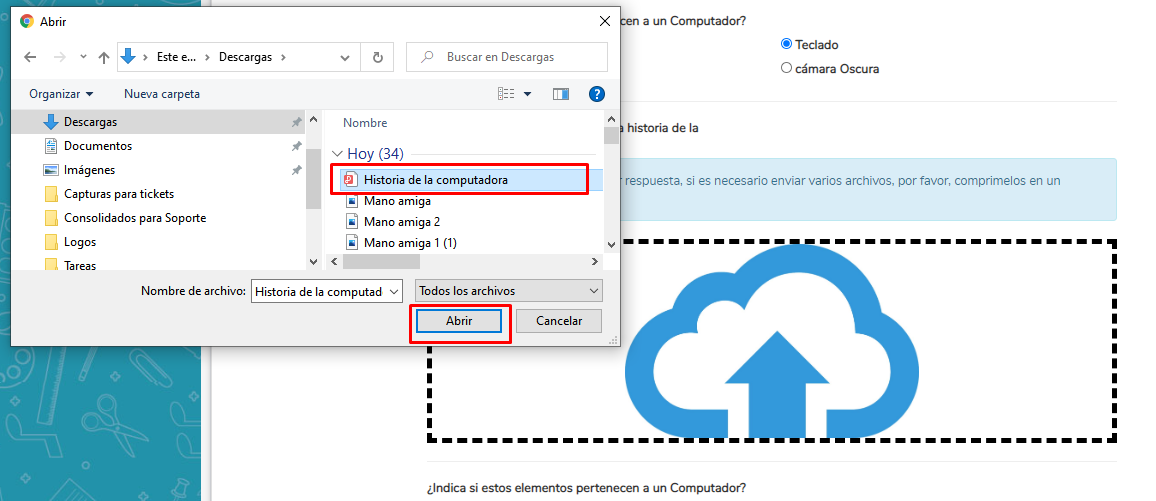 En estas te solicitaran que adjuntes un documento, para poder adjuntar el documento debes dar click en el rectángulo punteado y luego deberás escoger la ubicación de tu documento y presionar en abrir y listo ya estará adjunto.